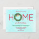 Anuncio de mudanza de hogar Feliz Navidad con corona de acuarela verde en un fondo de estrellas blancas y azules con tema invernal. Echa un vistazo a nuestra colección a continuación para más productos con este diseño.