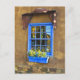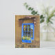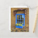 Personaliza esta postal. Una ventana de estilo francés de un azul cobalto brillante en una pared de adobe y piedra. Santa Fe, Nuevo México. Fotografía de Minerva Bloom.