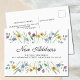 Este postal botánico de invitación está decorado con delicadas acuarelas y flores silvestres y follaje en tonos pastel. Dice Nueva dirección en tipografía de escritura elegante. Personalizable fácilmente con tu nueva dirección. El texto de la parte posterior también es personalizable o se puede eliminar. Acuarela original © Michele Davies.