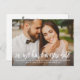 Anuncia el cambio de fecha de tu boda con estilo con estas tarjetas postales modernas de "así que tenemos una nueva fecha" que presentan tu foto de compromiso con un diseño de superposición de letra cepillada rústica. Incluye texto en el anverso y reverso de la postal que se puede personalizar con todos los detalles importantes del cambio de fecha. Nota, el filtro de gradiente de foto oscura se puede eliminar.