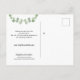 Para cuando las circunstancias significan que desafortunadamente se ha vuelto necesario que cambie la fecha de su boda, una forma práctica de informar a sus invitados sobre el cambio de planes y la nueva fecha lo antes posible. Este diseño elegante tiene una elegante hoja de eucalipto verde en la parte superior, con tipografía establecida New Plans en una escritura moderna, encima del texto con su mensaje que puede personalizar fácilmente junto con las palabras en el reverso que incluyen su sitio web de boda y los detalles de nombre y dirección de devolución.