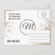 Glamuroso, chic y elegante falso brillo impreso en purpurina dorada sobre un fondo blanco, Tarjetas Postales de Save-the-Date de boda. Este diseño clásico y sofisticado es perfecto para la pareja que se casa trendy y elegante. Personalice con su propio mensaje en la parte delantera, así como una inicial de monograma personalizada en la parte posterior. Todo el diseño de impresión de fotos.