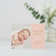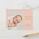 Moderna tarjeta de anuncio de nacimiento de niña con escritura dorada, para presentar a su hermoso bebé recién nacido. La parte frontal presenta una foto de su bebé junto con texto chic dorado y blanco para el nombre y estadísticas de nacimiento de su bebé en un panel de melocotón que puede personalizar al color de su elección. La parte posterior tiene estrellas doradas en cuerdas sobre un fondo de melocotón a juego. Diseñado por Thisisnotme©