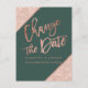 tipografía de oro rosa en bloque de color brillo de rosa profunda personalizable, y rayas geométricas de falso oro rosa chic cambiar la fecha de la boda, para anunciar el aplazamiento de su boda y nuevos planes