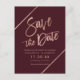 Tipografía en oro rosa sobre rayas geométricas rojas burdeos marsala y falsas rayas geométricas en oro rosa chic para guardar la fecha de la boda, perfecto para una boda elegante y con estilo,