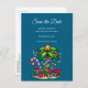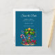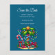 Tarjeta postal para guardar la fecha con una imagen festiva de temporada. Una palmera tropical decorada con luces festivas y una estrella en la parte superior. Una caña de caramelo gigante roja y blanca que sobresale de la arena. Regalos de Navidad debajo del árbol. Caprichoso y divertido.