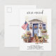 Anuncie su mudanza a familiares y amigos con nuestro anuncio de mudanza patriótico que presenta una hermosa pintura de acuarela de un perro Pastor Alemán, casa moderna con una puerta azul y la bandera estadounidense orgullosamente exhibida en el porche delantero. Este anuncio es perfecto para los amantes de los perros y cualquiera que busque anunciar su nueva dirección. Con su esquema de colores rojo, blanco y azul, este anuncio es una excelente manera de mostrar su amor por los EE. UU. mientras comparte sus emocionantes noticias. ¡Hágales saber a todos que "Nos hemos mudado!" e invítelos a venir a visitar y conocer a su mejor amigo en su nuevo hogar. DERECHOS DE AUTOR © 2023 Judy Burrows, Black Dog Art - Todos los derechos reservados. Tarjeta postal de anuncio de mudanza personalizada patriótica de Pastor Alemán.