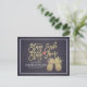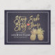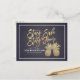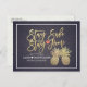 Plantillas de Tarjetas Postales de Postergación de Boda Modernas - Pareja de Piña con Hoja de Oro Falso Elegante sobre Fondo de Lino Damask Floral Azul Marino.