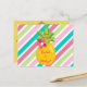 Notificar a los invitados los detalles iniciales de la ceremonia de su boda usando estas bellas tarjetas postales de fecha. Con un diseño rayado en diagonal rosa y azul y una piña en la parte superior, "Save the Date" se escribe de rosa con el nombre de la pareja dentro de la piña. La parte posterior de la tarjeta es amarilla con una etiqueta rosada en la parte superior. ¡Haga su pedido hoy mismo! Diseño de invitaciones: Bodas de Rhoadie Material gráfico de rayas de fondo: AMBilustraciones http://www.etsy.com/shop/AMBillustrations/ Diseño de piña: Prettygrafik (https://www.etsy.com/shop/Prettygrafikdesign)
