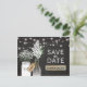 PLANTILLA DE AHORRO DE FECHA DE LUCES DE CADENA DE TARRO DE MASON | Un fondo de pizarra negra rústica, luces centelleantes de cadena, un tarro de mason y una botella con una etiqueta de regalo anudada alrededor con las iniciales de la pareja, flores blancas dulces, una pieza de madera de campo y elegante texto de ahorro de fecha. Encuentre otras tarjetas postales de ahorro de fecha de campo en http://www.zazzle.com/special_stationery