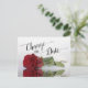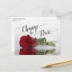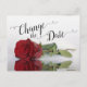 Esta hermosa tarjeta es una forma elegante de informar a sus amigos y familiares si se encuentran en la desafortunada posición de tener que posponer su próxima boda. Cuenta con un diseño elegante y romántico con una sola rosa roja reflejada en un estanque de agua, y caligrafía de letra inglesa que dice "cambiar la fecha". En la parte posterior hay espacio para una nota personalizada y firma.