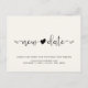 Incluso si circunstancias imprevistas requieren que pospongas tu boda, haz saber a tus invitados que tu amor y boda seguirán adelante con este sencillo anuncio de aplazamiento de boda y cambio de fecha en crema ligera. "nueva fecha" está escrito en tipografía moderna con un corazón que une las dos palabras. Debajo puedes personalizar tus nombres y tu nueva información de guardar la fecha y lugar si lo deseas. En el reverso, puedes personalizar con más detalle la información de cambio de fecha.