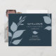 Esta boda económica ahorra la fecha postal con las minimalistas hojas azul polvorientas con la novia y los detalles de novios en blanco sobre un fondo azul de medianoche. La simple tarjeta se invierte para incluir la foto y el espacio de tu pareja para escribir en la dirección de los destinatarios. Para ver la línea de diseño de fondo de boda azul marino, visite www.zazzle.com/dotellabelle
