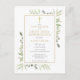 Con delicadas hojas de acuarela y un elegante crucifijo dorado, esta invitación de guardar la fecha de Primera Comunión chic y neutral en cuanto al género se puede personalizar con su información especial, con un fondo dorado en el reverso. Diseñada por Thisisnotme©