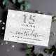 Un moderno Save the Date para una Quinceañera, 15 cumpleaños. Un fondo falso plateado decorado con purpurinas falsos, chispas. Personalice y agregue una fecha y un nombre/edad. El texto: Save the Date se escribe con un gran guión de estilo escrito a mano. Número 15 con un tipo de letra de estilo globo.