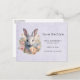 Save the date postcard with a sweet and adorable watercolor image. A bunny rabbit with white and gray fur. A garland of carnation flowers in pastel colors of pink and peach. A cute Easter, birthday or baby shower image for bunny rabbit lovers.