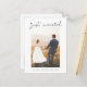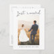 Tarjeta postal de anuncio de boda simple y moderna con una escritura informal a mano que dice "Recién Casados" con corazones encima de su foto. El mensaje en el reverso de la tarjeta es editable.