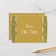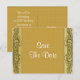 Precioso y sofisticado trabajo de rollo de oro sobre un fondo dorado y con una cinta de acabado de seda falsa coronada con un botón de monograma dorado como una joya con las palabras "50 aniversario". ¡A tiempo para su aniversario de bodas de oro!