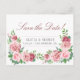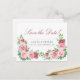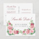 Elegante y distinguido anuncio de "save the date" para boda en postal con estilo romántico vintage que presenta hermosos ramos de esquina pintados a mano con rosas de color rosa claro y rojo burgundy con follaje verde vívido y texto personalizado sobre un fondo blanco claro. ++++++++++ ¡Personalízalo en ambos lados! +++++++++++++ Adecuado para una boda de jardín / al aire libre rústica y vintage de primavera, verano u otoño con rosas.