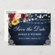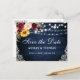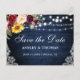 Rústico Blue Wood String Lights Lace Watercolor Floral Save the Date Postcard incluye rosas de marsala de color burdeos, rosas rosas rosas, rosas rojas, girasoles y vegetación botánica.
