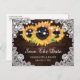 Tarjetas postales personalizadas de save the date de boda con girasoles rústicos con girasoles contra un fondo de madera rústica adornado con encaje floral blanco y luces de cuerda. Nuestra tarjeta postal de save the date de boda con girasol rústica es perfecta para una boda de campo rústica, o una fiesta de boda de granero inspirada en las flores de girasol.