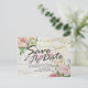 Boda Guardar las plantillas de postales de fecha - Flores rosa color de agua vintage y elegantes luces de cuerda sobre fondo de textura de madera suave de color blanco de luz rústica. ¡Un Diseño Perfecto Para Tu Gran Día! Todos Los Estilo De Texto, Los Colores Y Los Tamaños Se Pueden Modificar Para Ajustarse A Sus Necesidades.