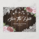 Elegante boda rústica ruidosa rosa floral salva las postales de fecha ideal para una romántica fiesta de boda rústica rosa y lustre. Esto permite guardar la postal de fecha con un fondo de madera de granero adornado con rosas rosas rosas rosas rosas, encaje floral blanco y luces de cuerda. Elementos coincidentes disponibles.