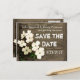Bonita boda rústica de moda rural con la tarjeta postal Save The Date, con una fotografía realzada con un toque gráfico de una valla rústica de madera. La flor de los árboles de madera de palo blanco bonito decora la esquina inferior izquierda de la tarjeta. El texto en blanco en la parte delantera es totalmente personalizable para satisfacer las necesidades de su boda. El mismo diseño está en la parte posterior de la tarjeta, con un área de texto blanco transparente para la escritura de direcciones. Productos bodas a juego disponibles.