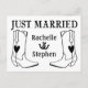 Anuncien orgullosamente a sus amigos y familia que tú y tu novia acaban de atar el nudo con esta linda postal de invitación de boda occidental. Esta divertida invitación boda presenta botas de vaquero dibujadas a mano y herraduras resaltadas en un ambiente rústico de madera gris.