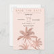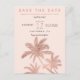 Sálvese la fecha elegante con árboles de palma en rosa y oro rosa. Árbol de palma dorado falso moderno con tipografía simple, un tema de boda tropical y trendy para sálvese la fecha.