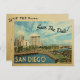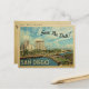 Vintage San Diego Save The Date postales con vistas panorámicas a la ciudad. Este moderno diseño retro de mediados de siglo es la manera perfecta de reunir a los huéspedes para su boda de destino en San Diego California.