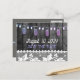 Tarjeta postal de save the date rústica con encaje de madera, luces de cuerda. Fácil de personalizar ahora con los detalles de su boda. Diseño de Alma Wad. Todos los elementos están impresos. Esta versión viene en negro, blanco y morado con fuentes manuscritas de moda.