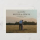 Sencillos y elegantes emparejamientos de tipos de letra y una tarjeta postal con fotografía de compromiso de sangrado completa marcan el tono de una elegante boda con esto guardar la tarjeta de fecha. Añade información adicional sobre eventos, un sitio web boda y devuelve la dirección a la parte posterior.