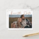 Esta tarjeta postal de guardar la fecha de la boda de color marrón sienna presenta un cálido color regio sobre una foto de compromiso otoñal de la feliz pareja. La encantadora escritura minimalista de color bronceado presenta tipografía cursiva simple junto con una fuente serif moderna y elegante. Este suave marrón es perfecto para un evento de tarde de otoño.
