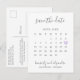 Moderno salve la postal de fecha con un sencillo calendario en gris suave con las palabras "Save the Date" (Salva la fecha) y sus nombres en un elegante tipo de letra manuscrita y un corazón púrpura pastel que rodea su cita, sobre un fondo blanco. Añade tu dirección de retorno y tu mensaje personal al reverso. CONSEJO DE DISEÑO: Para una columna que no tiene una fecha en la primera fila (semana), agregue un espacio antes del primer número. Si necesitas ayuda para personalizar el calendario, por favor siéntete libre de contactarme a través del botón de "contacto".