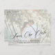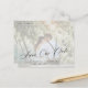 Moderna tarjeta postal de boda chic romántico guardar la fecha con su foto personalizada en overlay transparente de vellum blanco falso de moda y caligrafía a mano negra. +++++++++++ ¡Fácil de personalizar con sus detalles y foto en ambos lados!