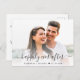 Moderna y moda salven la postal del anuncio de fecha. Tu foto está rebosada con "felizmente siempre después" en un guión elegante con toques y tus nombres y fecha de boda se unen con un corazón. En la parte posterior, personalizar el mensaje de fecha guardado en una tipografía elegante y agregue los nombres en un guión tipo firma.