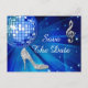 Elegante, glamoroso cumpleaños número 50 / cumpleaños número cincuenta salva las postales de fecha. Glamour y glitz a la moda Ahorra las fechas para las celebraciones de su fiesta de 50/50 años. Hermosa y deslumbrante plata respira diamantes de joyas joyas de la imagen de la nota musical, una divertida bola de espejo de la discoteca retro azul funky y un estilete purpurinoso plateado a imagen de zapatos de alta tecnología sobre un fondo azul moda. Un bonito bonito, elegante, de moda, elegante, salva la tarjeta postal para fiestas de cumpleaños de mujeres. A las mujeres les encantará este diseño genial, divertido, divertido y jovial por su música glamurosa y sus fiestas bailarinas 50/50.