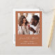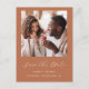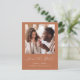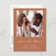 Esta simple y minimalista postal Save the Date muestra una foto cuadrada encima de las palabras "Save the Date" en un elegante guión de escritura a mano en blanco, seguido por los nombres de la pareja, la fecha boda y la ciudad en letra sans serif en un fondo de terracota. Añada una segunda foto horizontal y un mensaje más detallado con información adicional sobre el reverso, junto con su dirección de retorno.