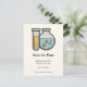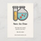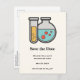 Tarjeta postal de guardar la fecha con una ilustración adorable de un tubo de ensayo que contiene líquido amarillo y un frasco/vaso de precipitados redondeado que contiene líquido verde con burbujas rojas.