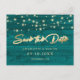 Boda de madera rústica verde azulada y personalizado salva las postales de fecha con un fondo rústico de madera adornado con luces de cuerda. Personalice fácilmente este rústico ahorre la postal de fecha con los detalles de su boda. Para solicitudes de personalizado, por favor envíenos un mensaje.