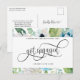 ¿Recién comprometido? ¡Felicidades! Comparte con familiares y amigos tu gran noticia con esta elegante tarjeta postal de anuncio de compromiso. Hermoso diseño con fondo floral de acuarela pintada a mano con flores y follaje en tonos blancos, azul polvoriento y verde, con una sección blanca en el centro con sus nombres y la frase "Nos comprometimos" en hermosa caligrafía manuscrita. Posibilidad de agregar su propio mensaje y añadir información adicional (como detalles de la fiesta de compromiso o información para guardar la fecha) si lo desea, para agregar más líneas de texto puede seleccionar personalizar más. Parte trasera con elementos de caligrafía manuscrita y detalles florales en la parte inferior.
