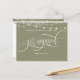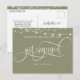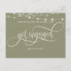 ¿Acabas de comprometerte? ¡Felicidades! Comparte con familiares y amigos tu gran noticia con esta elegante tarjeta postal de anuncio de compromiso simple. Fondo verde salvia con luces de cuerda románticas en la parte superior y la frase "Me comprometí" en hermosa caligrafía blanca a mano. Posibilidad de agregar tu propio mensaje y agregar información adicional (como información de la fiesta de compromiso o información de guardar la fecha) si lo deseas, para agregar más líneas de texto puedes seleccionar personalizar más. Parte trasera con elementos de caligrafía a mano y borde verde salvia en la parte superior con detalle de luces de cuerda.