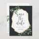 Hermosas tarjetas postales de boda en verde y dorado con letras grises enmarcadas por un borde geométrico dorado y follaje de acuarela verde oscuro de cazador, hojas y bayas blancas sobre un fondo negro suave contrastante. Personalice con sus nombres, fecha de la boda y ubicación, y agregue cualquier información adicional, como el sitio web de su boda, al reverso. Una opción moderna en una paleta de colores naturales para bodas boho, boscosas o de temática natural en cualquier estación.