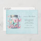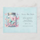 Save the date postcard with a magical image featuring pastel colored butterflies in a jar.