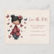 Save the date postcard with a cute fairy holding a butterfly wand. An adorable unique retro style doll with rosy cheeks. Butterflies flying all around.