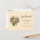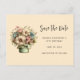 Save the date postcard with a cute image. Blue. pink and cream colored flowers with green leaves. Set inside a green flower pot with a green plaid cloth hanging over the side.