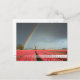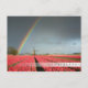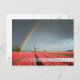 Postal de un arcoíris colorido en un cielo oscuro sobre un molino de viento y un campo lleno de tulipanes rojos brillantes durante una tormenta de primavera en un paisaje cerca de Amsterdam en los Países Bajos con una barra que se desvanece y el texto: 'Países Bajos'.