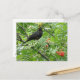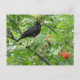 Esta hermosa postal muestra una fotografía de un pájaro negro sentado en un árbol. Colgando del árbol hay grupos de bayas rojas brillantes. Esta foto fue tomada durante el verano.