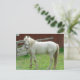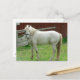 La postal del caballo blanco es un caballo blanco parado frente a una valla y un granero rojo